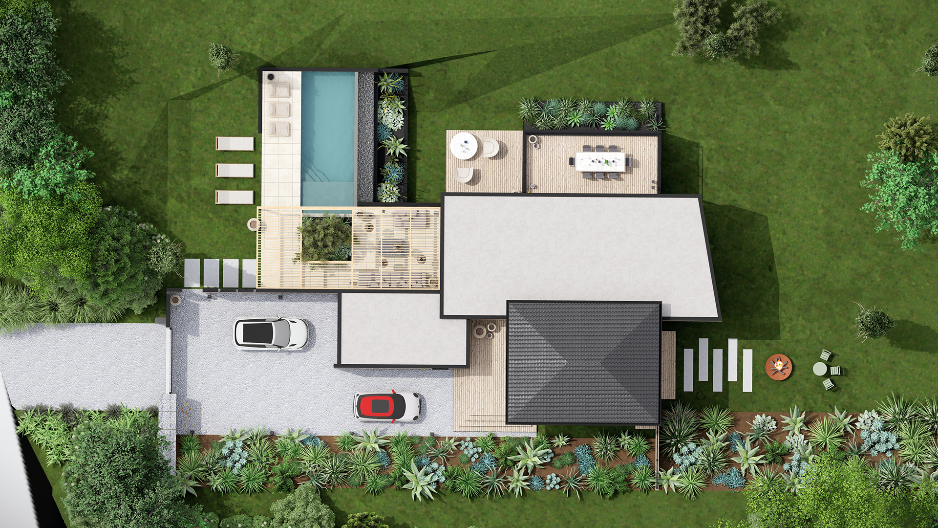 Création du plan d’aménagement paysager définissant l’organisation globale : accès, allées, terrasses, piscine, plantations, structures et espaces de vie extérieurs.