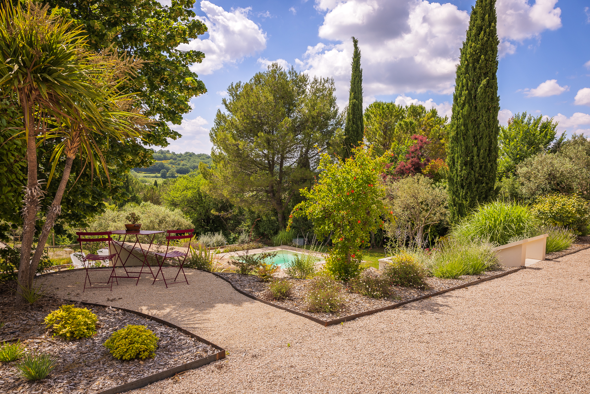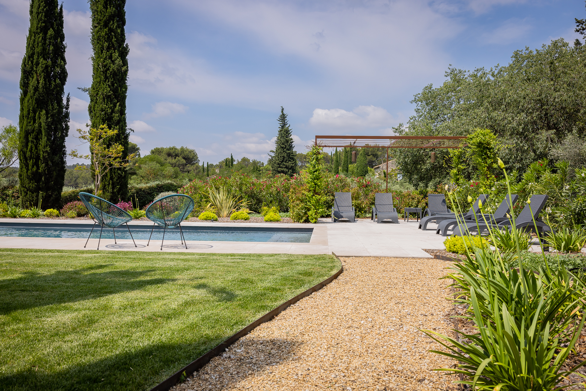 Ce jardin a été pensé comme un lieu de détente et de convivialité. Chaque zone a été aménagée pour profiter pleinement de l’extérieur, que ce soit autour de la piscine, sur les terrasses ou dans les espaces végétalisés.