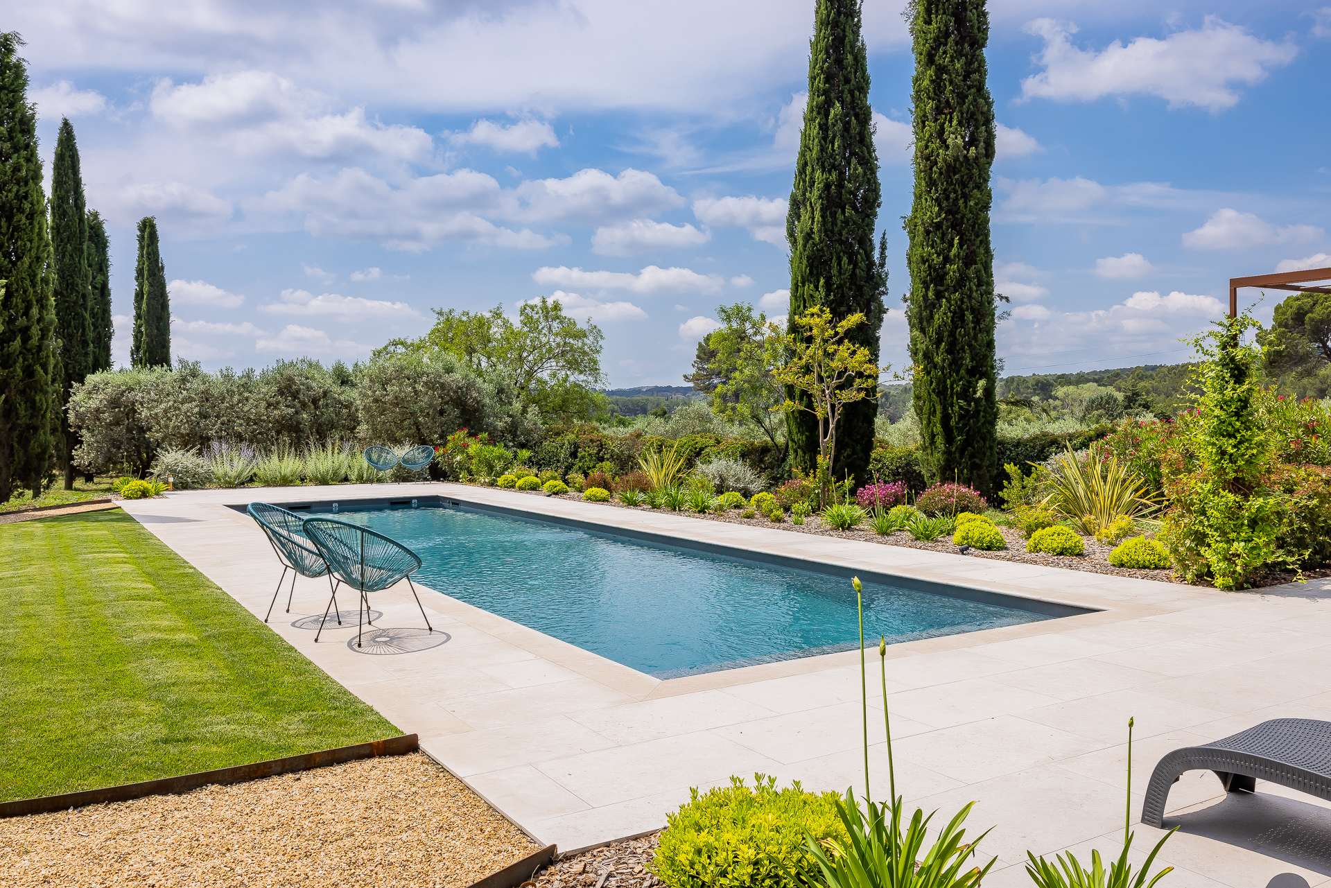 Les lignes ont été pensées pour structurer le terrain tout en conservant une ambiance naturelle et élégante.