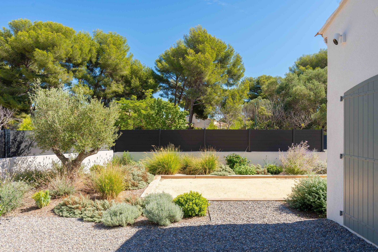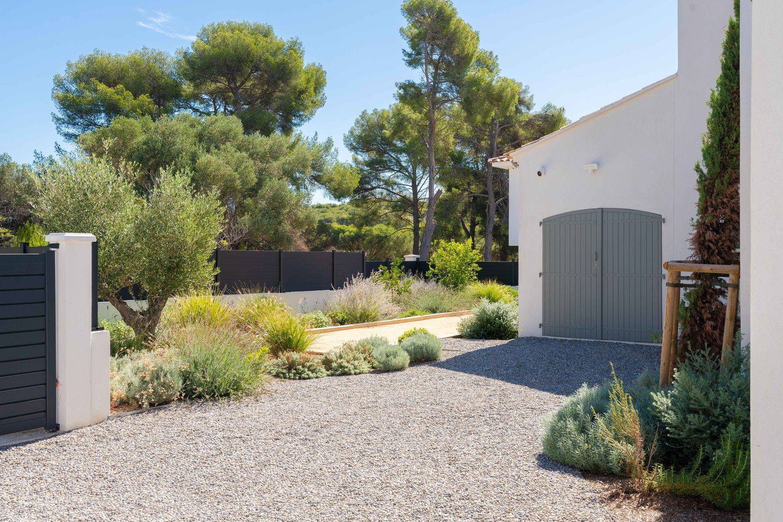 L’entrée paysagère a été soigneusement aménagée avec une allée en gravier aux lignes épurées, garantissant une circulation pratique et durable. Des plantations méditerranéennes, composées d’arbustes persistants et de végétaux adaptés au climat sec, structurent l’espace et apportent une touche naturelle et élégante. Ce cheminement végétal crée une transition douce entre la maison et le jardin, améliorant l’accueil et la première impression du lieu.