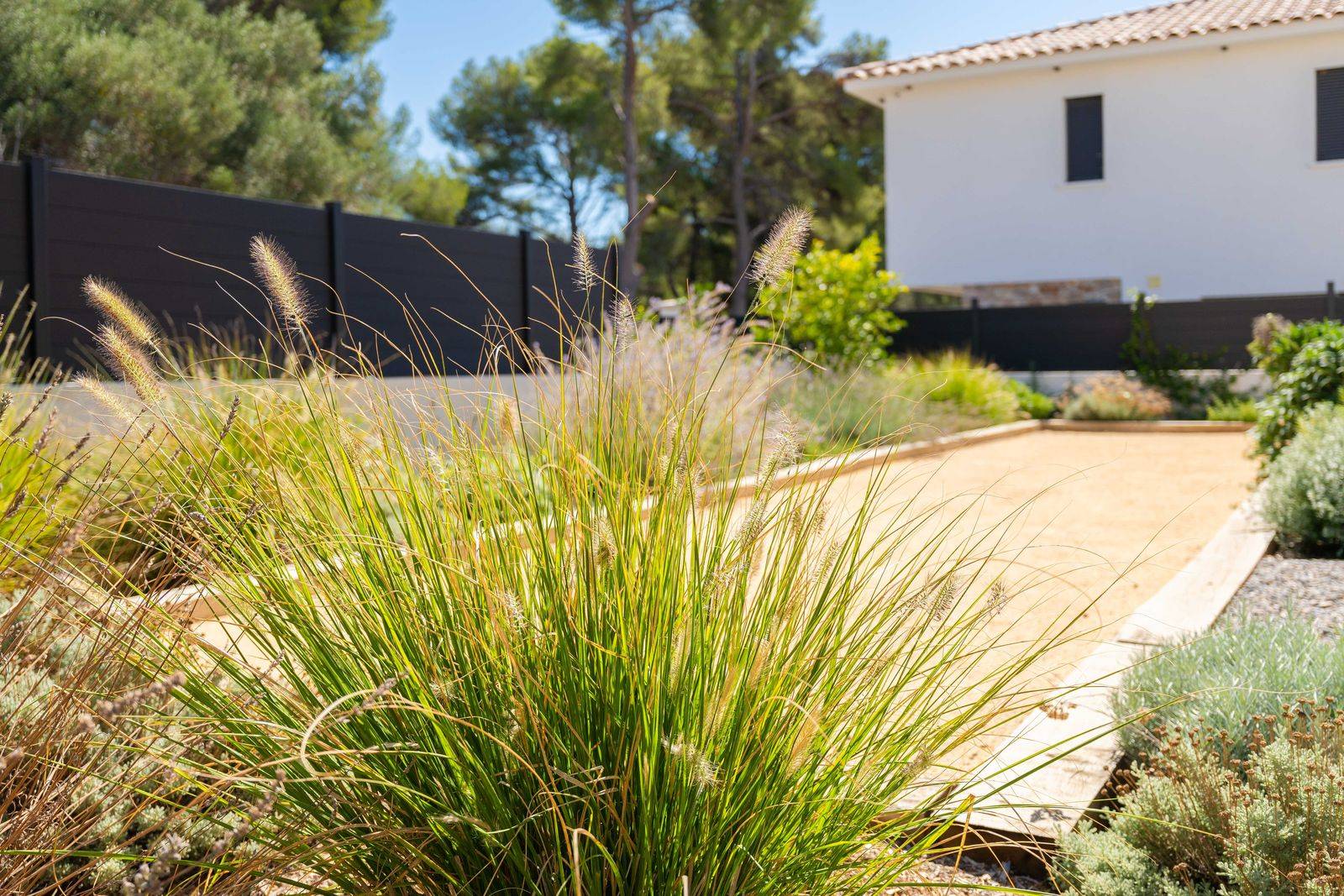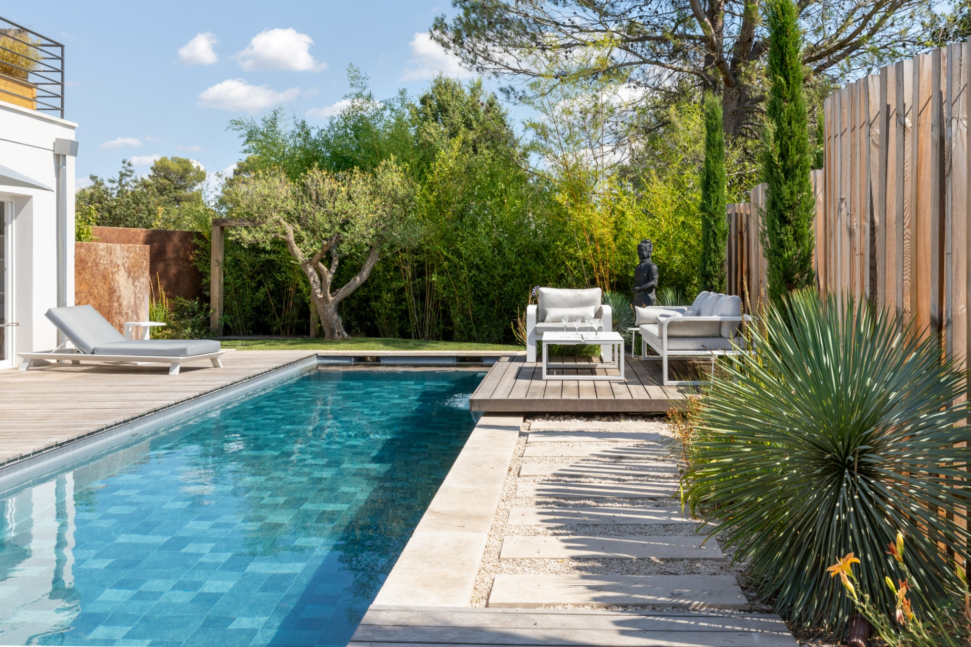 Le choix des végétaux méditerranéens, reconnus pour leur résistance et leur faible besoin en eau, assure une gestion écologique et durable du jardin. Leur implantation stratégique crée des zones d’ombre et d’intimité, tout en mettant en valeur la piscine comme point central de l’aménagement paysager.